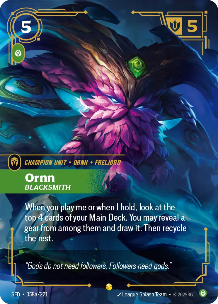 Ornn, Blacksmith belongs to the SFD set and has a rarity of Showcase.